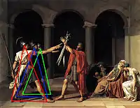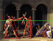 On observe que la règle des tiers a été parfaitement appliquée et centre ainsi le regard du spectateur sur le « tiers central » : les mains tendues des Horaces vers les glaives détenus par le père ; l’accent est mis sur le serment prêté.