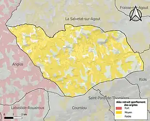 Le retrait-gonflement des sols argileux est susceptible d'engendrer des dommages importants aux bâtiments en cas d’alternance de périodes de sécheresse et de pluie. 71,8 % de la superficie communale est en aléa moyen ou fort (59,3 % au niveau départemental et 48,5 % au niveau national). Sur les 259 bâtiments dénombrés sur la commune en 2019, 238 sont en aléa moyen ou fort, soit 92 %, à comparer aux 85 % au niveau départemental et 54 % au niveau national. Une cartographie de l'exposition du territoire national au retrait gonflement des sols argileux est disponible sur le site du BRGM[27],[Carte 2].