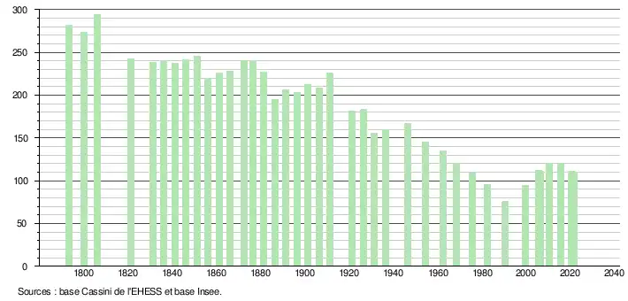 L'évolution du nombre d'habitants est connue à travers les recensements de la population effectués dans la commune depuis 1793. Pour les communes de moins de 10 000 habitants, une enquête de recensement portant sur toute la population est réalisée tous les cinq ans, les populations légales des années intermédiaires étant quant à elles estimées par interpolation ou extrapolation[15]. Pour la commune, le premier recensement exhaustif entrant dans le cadre du nouveau dispositif a été réalisé en 2005[16].