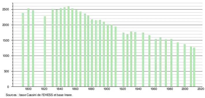- Dans le tableau des recensements et le graphique, par convention dans Wikipédia, le principe a été retenu, pour les populations légales postérieures à 1999 de n’afficher dans le tableau des recensements et le graphique que les populations correspondant à l'année 2006, première population légale publiée calculée conformément aux concepts définis dans le décret no 2003-485 du 5 juin 2003, et les années correspondant à une enquête exhaustive de recensement pour les communes de moins de 10 000 habitants, ainsi que la dernière population légale publiée par l’Insee.