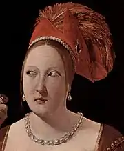 Elle porte une toque rouge à cornes décorée d'une plume d'autruche frisée et teintée en carmin, ainsi que d'une broche circulaire faite d'une pierre noire cerclée d'or, terminée par un pendentif en perle. Elle est vêtue d'une élégante robe de velours ocre-brun décorée de galons d'or et de boules dorées aux emmanchures. Ses manches à crevés aux bordures en croquets dorés laissent voir leur doublure de soie jaune, et la blancheur d'une chemise[42]. Sa main gauche, dont le tranchant repose sur la table, tient quatre cartes, dont le dos blanc seul est visible. Devant ces cartes sont étalées, sur la table, huit pièces d'or. De l'index de la main droite légèrement replié, elle s'adresse au tricheur, qui ne la regarde pas. Ses yeux en coin regardent vers le haut, vers la servante, à « l'image des voies obliques qui caractérisent le monde[43] ».