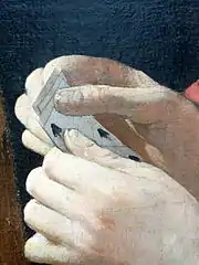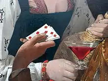 La piste de la cartomancie a en outre été suggérée, quoique envisagée avec prudence, pour donner aux cartes des valeurs symboliques : les carreaux désignent, dans la divination par les tarots, l'argent et le commerce, y compris sexuel. L'as annonce une opération fructueuse — ici la tricherie —, et le sept son succès[52]. Le six de pique que tient le jeune homme est en revanche le signe du malheur et de la lutte contre le destin. Ceci confirme donc ce que le spectateur ne peut qu'imaginer quant à la suite de la scène qu'il a sous les yeux : une fois dépouillé de son argent, le jeune homme n'aura pas non plus les faveurs de la courtisane, dont les appâts n'auront servi qu'à le berner[53].