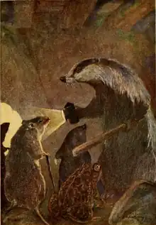 - Blaireau : un animal bourru, solitaire et qui « déteste tout simplement la société », et également un bon ami de Taupe et Rat. C'était aussi un ami de Crapaud père à présent mort, et il est souvent ferme et autoritaire avec son fils, mais en même temps, il est généralement patient et bien intentionné à son égard. Il peut être considéré comme un sage ermite, un bon meneur de groupe et un gentleman, incarnant la sagesse. Il est aussi courageux et un habile combattant, et il aide à expulser les belettes du manoir Crapaud.