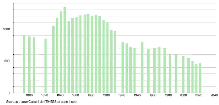L'évolution du nombre d'habitants est connue à travers les recensements de la population effectués dans la commune depuis 1793. Pour les communes de moins de 10 000 habitants, une enquête de recensement portant sur toute la population est réalisée tous les cinq ans, les populations légales des années intermédiaires étant quant à elles estimées par interpolation ou extrapolation[18]. Pour la commune, le premier recensement exhaustif entrant dans le cadre du nouveau dispositif a été réalisé en 2006[19].