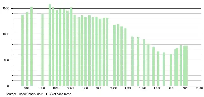 L'évolution du nombre d'habitants est connue à travers les recensements de la population effectués dans la commune depuis 1793. Pour les communes de moins de 10 000 habitants, une enquête de recensement portant sur toute la population est réalisée tous les cinq ans, les populations légales des années intermédiaires étant quant à elles estimées par interpolation ou extrapolation[19]. Pour la commune, le premier recensement exhaustif entrant dans le cadre du nouveau dispositif a été réalisé en 2008[20].