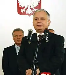 Après l'élection présidentielle, son frère jumeau, Jarosław Kaczyński refuse de devenir président du Conseil des ministres, poste finalement confié à Kazimierz Marcinkiewicz. Celui-ci démissionne en , après quoi le PiS appelle à la nomination de Jarosław Kaczyński à la tête du gouvernement, proposition finalement acceptée par le président de la République. La Pologne est alors le seul pays où deux frères occupèrent simultanément les postes de chef d'État et de chef du gouvernement. Le duo qu'ils forment devient une figure marquante au sein de l'Union européenne, dont la Pologne est membre depuis l'élargissement de 2004.