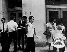 Quelques jours plus tard, le , un ami de Bringuier repère Lee Harvey Oswald en train de distribuer des tracts pro-Castro. La seconde rencontre entre Bringuier et deux autres membres, Miguel Cruz et Celso Hernandez, qui sont aussi membres du DRE, débouche sur une arrestation collective[40],[37]. La police confisque également les prospectus de Lee Harvey Oswald sur lesquels figurent l'adresse du 544 Camp Street New Orléans, l'adresse de la seconde entrée du bâtiment où se trouvait l'agence de détective privée de Guy Banister[41]. Ancien agent du FBI, anti-communiste convaincu, lié à la John Birch Society qui prônait la supériorité de la race blanche, son agence de détective privée travaillait en réalité comme couverture pour le soutien logistique et tactique aux opérations anti-castristes mises en place par la CIA et dirigées contre Cuba au cours des années 1960.