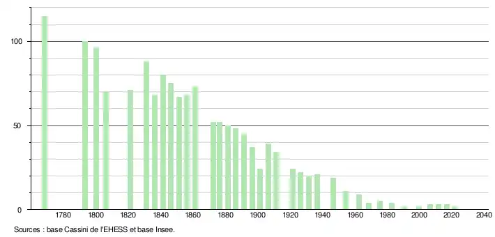 L'évolution du nombre d'habitants est connue à travers les recensements de la population effectués dans la commune depuis 1768. Pour les communes de moins de 10 000 habitants, une enquête de recensement portant sur toute la population est réalisée tous les cinq ans, les populations légales des années intermédiaires étant quant à elles estimées par interpolation ou extrapolation[34]. Pour la commune, le premier recensement exhaustif entrant dans le cadre du nouveau dispositif a été réalisé en 2006[35].