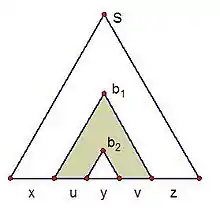 Soit la longueur maximale des membres droits des règles. On pose et . Considérons un arbre de dérivation pour le mot . Par définition, l'arbre est de degré et possède des feuilles distinguées qui sont les positions distinguées de . L'arbre possède une branche ayant au moins nœuds spéciaux, notés . Chacun de ces nœuds a au moins un fils distingué qui n'est pas sur la branche ; le nœud est gauche si ce fils est à gauche de la branche, il est droit sinon. Comme , il y a au moins sommets distingués soit tous gauches, soit tous droits. Comme ce nombre est supérieur au nombre de variables, deux sommets et (notés et sur la figure), avec , sont étiquetés avec la même variable . L'arbre donne alors les dérivations