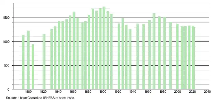 L'évolution du nombre d'habitants est connue à travers les recensements de la population effectués dans la commune depuis 1793. Pour les communes de moins de 10 000 habitants, une enquête de recensement portant sur toute la population est réalisée tous les cinq ans, les populations légales des années intermédiaires étant quant à elles estimées par interpolation ou extrapolation[16]. Pour la commune, le premier recensement exhaustif entrant dans le cadre du nouveau dispositif a été réalisé en 2005[17].