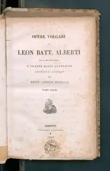 - De re aedificatoria (L'Art d'édifier), traité d'architecture commencé en 1449 imprimé en 1485 à Florence[12], puis en 1512 à Paris et 1541 à Strasbourg. Il a été traduit en français par Jean Martin en 1553 sous le titre L’Architecture et Art de bien bastir[13]. Il a également été traduit en espagnol et portugais au XVIe siècle, puis en anglais au XVIIIe siècle, et en allemand, russe, japonais, etc. au XXe siècle.