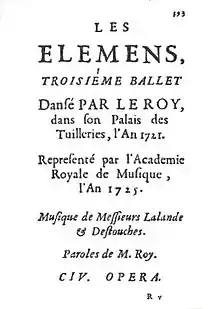 - (1725) Les Élémens, Ballet, Dansé par le Roy, Dans son Palais des Thuilleries, le 22 Decembre 1721, Réprésenté par l'Académie Royale de Musique le 15 May 1725, Paris, Ribou, 1725 (accessible en ligne en Gallica - B.N.F.)