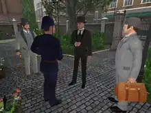 Holmes et Watson, en compagnie du Capitaine Stenwick et d'un agent de Scotland Yard.