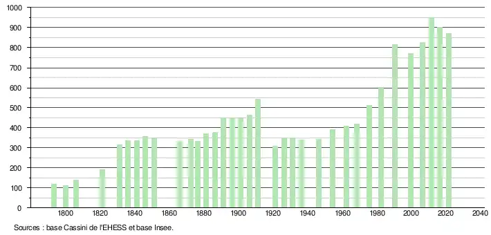 L'évolution du nombre d'habitants est connue à travers les recensements de la population effectués dans la commune depuis 1793. Pour les communes de moins de 10 000 habitants, une enquête de recensement portant sur toute la population est réalisée tous les cinq ans, les populations légales des années intermédiaires étant quant à elles estimées par interpolation ou extrapolation[21]. Pour la commune, le premier recensement exhaustif entrant dans le cadre du nouveau dispositif a été réalisé en 2006[22].