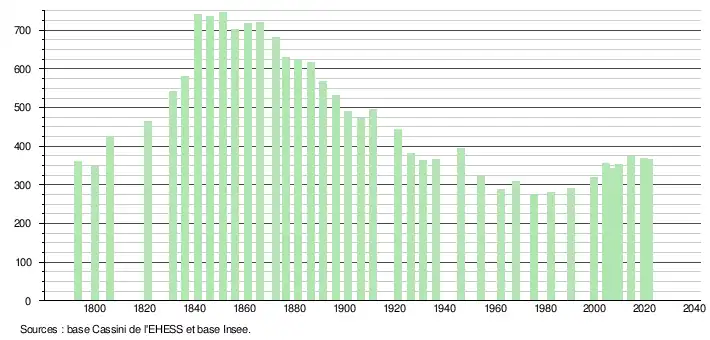 L'évolution du nombre d'habitants est connue à travers les recensements de la population effectués dans la commune depuis 1793. Pour les communes de moins de 10 000 habitants, une enquête de recensement portant sur toute la population est réalisée tous les cinq ans, les populations légales des années intermédiaires étant quant à elles estimées par interpolation ou extrapolation[29]. Pour la commune, le premier recensement exhaustif entrant dans le cadre du nouveau dispositif a été réalisé en 2004[30].