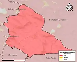 Le retrait-gonflement des sols argileux est susceptible d'engendrer des dommages importants aux bâtiments en cas d’alternance de périodes de sécheresse et de pluie. La totalité de la commune est en aléa moyen ou fort (75,2 % au niveau départemental et 48,5 % au niveau national). Sur les 131 bâtiments dénombrés sur la commune en 2019, 131 sont en aléa moyen ou fort, soit 100 %, à comparer aux 94 % au niveau départemental et 54 % au niveau national. Une cartographie de l'exposition du territoire national au retrait gonflement des sols argileux est disponible sur le site du BRGM[22],[Carte 3].
