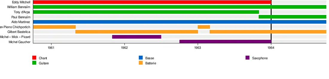- Jean Bouchéty (1920-2006[11]) : contrebasse/basse (arrangeur du groupe puis d'Eddy Mitchell, il tient l'instrument sur quelques-uns des premiers titres en 1961) ;