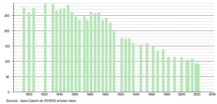 L'évolution du nombre d'habitants est connue à travers les recensements de la population effectués dans la commune depuis 1793. Pour les communes de moins de 10 000 habitants, une enquête de recensement portant sur toute la population est réalisée tous les cinq ans, les populations légales des années intermédiaires étant quant à elles estimées par interpolation ou extrapolation[16]. Pour la commune, le premier recensement exhaustif entrant dans le cadre du nouveau dispositif a été réalisé en 2008[17].