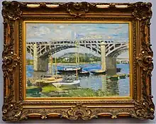 Le pont d’Asnières est très récent. Il remplace un ouvrage détruit pendant la guerre de 1870. Il est composé de sept travées en fonte soutenant une structure en bois, reprises par des piles en maçonnerie. Il sera remplacé au début du XXe siècle[5]. Une seule de ses travées est représentée. La structure est la même que celle du pont d'Argenteuil reconstruit également après 1870, et figurant sur plusieurs autres tableaux[2].