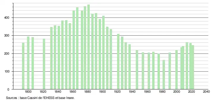 L'évolution du nombre d'habitants est connue à travers les recensements de la population effectués dans la commune depuis 1793. Pour les communes de moins de 10 000 habitants, une enquête de recensement portant sur toute la population est réalisée tous les cinq ans, les populations légales des années intermédiaires étant quant à elles estimées par interpolation ou extrapolation[15]. Pour la commune, le premier recensement exhaustif entrant dans le cadre du nouveau dispositif a été réalisé en 2008[16].