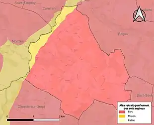 Le retrait-gonflement des sols argileux est susceptible d'engendrer des dommages importants aux bâtiments en cas d’alternance de périodes de sécheresse et de pluie. La totalité de la commune est en aléa moyen ou fort (67,4 % au niveau départemental et 48,5 % au niveau national). Sur les 119 bâtiments dénombrés sur la commune en 2019, 119 sont en aléa moyen ou fort, soit 100 %, à comparer aux 84 % au niveau départemental et 54 % au niveau national. Une cartographie de l'exposition du territoire national au retrait gonflement des sols argileux est disponible sur le site du BRGM[18],[Carte 2].