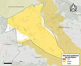 Le retrait-gonflement des sols argileux est susceptible d'engendrer des dommages importants aux bâtiments en cas d’alternance de périodes de sécheresse et de pluie. 89 % de la superficie communale est en aléa moyen ou fort (67,4 % au niveau départemental et 48,5 % au niveau national). Sur les 66 bâtiments dénombrés sur la commune en 2019, 62 sont en aléa moyen ou fort, soit 94 %, à comparer aux 81 % au niveau départemental et 54 % au niveau national. Une cartographie de l'exposition du territoire national au retrait gonflement des sols argileux est disponible sur le site du BRGM[20],[Carte 3].