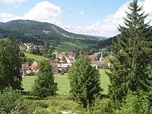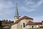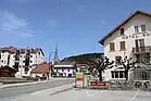 ![]() ![]() ![]() ![]() ![]() De haut en bas et de gauche à droite: Panorama du bourg depuis le Chemin des Ravières; l'église Sainte-Geneviève (inscrite MH); la mairie; l'ancienne gare de la ligne de Pontarlier à Vallorbe; la place du monument. |