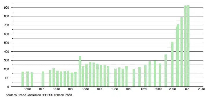 L'évolution du nombre d'habitants est connue à travers les recensements de la population effectués dans la commune depuis 1793. Pour les communes de moins de 10 000 habitants, une enquête de recensement portant sur toute la population est réalisée tous les cinq ans, les populations légales des années intermédiaires étant quant à elles estimées par interpolation ou extrapolation[35]. Pour la commune, le premier recensement exhaustif entrant dans le cadre du nouveau dispositif a été réalisé en 2007[36].