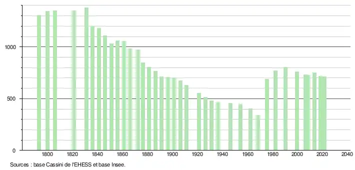 L'évolution du nombre d'habitants est connue à travers les recensements de la population effectués dans la commune depuis 1793. Pour les communes de moins de 10 000 habitants, une enquête de recensement portant sur toute la population est réalisée tous les cinq ans, les populations légales des années intermédiaires étant quant à elles estimées par interpolation ou extrapolation[14]. Pour la commune, le premier recensement exhaustif entrant dans le cadre du nouveau dispositif a été réalisé en 2008[15].