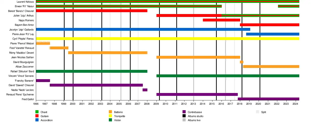 - Jocelyn « Jojo » Gallardo — accordéon, trombone, claviers, guitare (1996—2019)