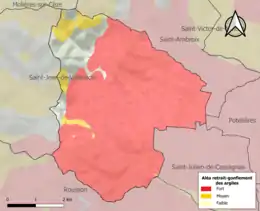 La commune est vulnérable au risque de mouvements de terrains constitué principalement du retrait-gonflement des sols argileux[23]. Cet aléa est susceptible d'engendrer des dommages importants aux bâtiments en cas d’alternance de périodes de sécheresse et de pluie. 89,3 % de la superficie communale est en aléa moyen ou fort (67,5 % au niveau départemental et 48,5 % au niveau national). Sur les 978 bâtiments dénombrés sur la commune en 2019, 933 sont en aléa moyen ou fort, soit 95 %, à comparer aux 90 % au niveau départemental et 54 % au niveau national. Une cartographie de l'exposition du territoire national au retrait gonflement des sols argileux est disponible sur le site du BRGM[24],[Carte 2].