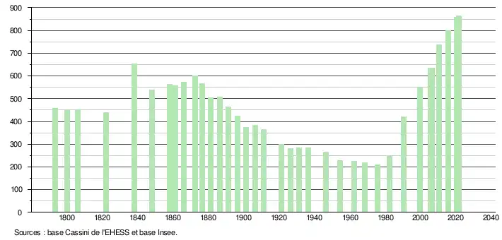 L'évolution du nombre d'habitants est connue à travers les recensements de la population effectués dans la commune depuis 1793. Pour les communes de moins de 10 000 habitants, une enquête de recensement portant sur toute la population est réalisée tous les cinq ans, les populations légales des années intermédiaires étant quant à elles estimées par interpolation ou extrapolation[20]. Pour la commune, le premier recensement exhaustif entrant dans le cadre du nouveau dispositif a été réalisé en 2005[21].