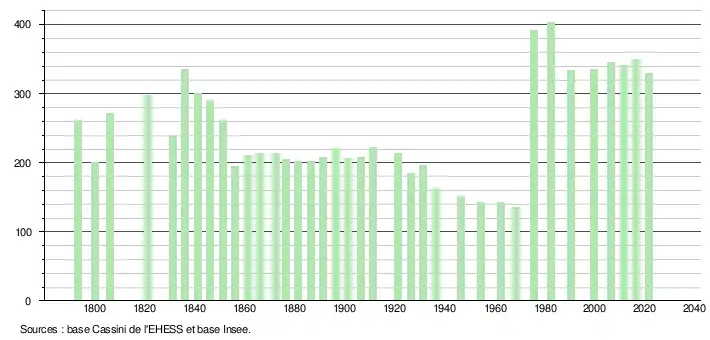 L'évolution du nombre d'habitants est connue à travers les recensements de la population effectués dans la commune depuis 1793. Pour les communes de moins de 10 000 habitants, une enquête de recensement portant sur toute la population est réalisée tous les cinq ans, les populations légales des années intermédiaires étant quant à elles estimées par interpolation ou extrapolation[25]. Pour la commune, le premier recensement exhaustif entrant dans le cadre du nouveau dispositif a été réalisé en 2006[26].