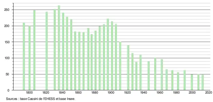 - Dans le tableau des recensements et le graphique, par convention dans Wikipédia, le principe a été retenu, pour les populations légales postérieures à 1999 de n’afficher dans le tableau des recensements et le graphique que les populations correspondant à l'année 2006, première population légale publiée calculée conformément aux concepts définis dans le décret no 2003-485 du 5 juin 2003, et les années correspondant à une enquête exhaustive de recensement pour les communes de moins de 10 000 habitants, ainsi que la dernière population légale publiée par l’Insee.