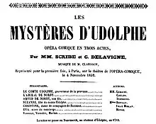 - Les Mystères d’Udolphe est aussi un opéra-comique en trois actes, de Louis Clapisson sur un livret d'Eugène Scribe et de Germain Delavigne, créé le à l'Opéra-Comique[2].