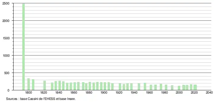 L'évolution du nombre d'habitants est connue à travers les recensements de la population effectués dans la commune depuis 1793. Pour les communes de moins de 10 000 habitants, une enquête de recensement portant sur toute la population est réalisée tous les cinq ans, les populations légales des années intermédiaires étant quant à elles estimées par interpolation ou extrapolation[15]. Pour la commune, le premier recensement exhaustif entrant dans le cadre du nouveau dispositif a été réalisé en 2005[16].