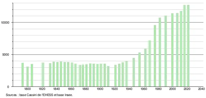 4. Par convention dans Wikipédia, le principe a été retenu de n’afficher dans le tableau des recensements et le graphique, pour les populations légales postérieures à 1999, que les populations correspondant à une enquête exhaustive de recensement pour les communes de moins de 10 000 habitants, et que les populations des années 2006, 2011, 2016, etc. pour les communes de plus de 10 000 habitants, ainsi que la dernière population légale publiée par l’Insee pour l'ensemble des communes.