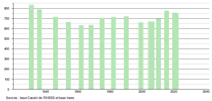 L'évolution du nombre d'habitants est connue à travers les recensements de la population effectués dans la commune depuis 1931. Pour les communes de moins de 10 000 habitants, une enquête de recensement portant sur toute la population est réalisée tous les cinq ans, les populations légales des années intermédiaires étant quant à elles estimées par interpolation ou extrapolation[17]. Pour la commune, le premier recensement exhaustif entrant dans le cadre du nouveau dispositif a été réalisé en 2005[18].