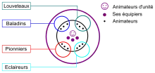 L'unité est pilotée par un staff d'unité, composé de l'animateur d'unité (AnU), assisté dans sa tâche par une équipe d'équipiers d'unité (EqU) et, éventuellement, de collaborateur(s) d'unité (CoU).