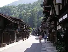 Bien que le parcours de la Nakasendō ait fait l'objet de beaucoup de développements à l'époque moderne, quelques portions de la route conservent leur aspect originel, cependant que d'autres ont été restaurées pour retrouver leur aspect initial au cours des dernières décennies. La section la plus connue se trouve dans la vallée de la Kiso, entre Tsumago-juku (42e station du Kiso Kaidō d'Hiroshige) dans la préfecture de Nagano et Magome-juku (43e station) dans la préfecture de Gifu[46]. La région attira l'attention avec l'écrivain du début du XXe siècle Shimazaki Tōson, qui rédigea une chronique des effets de la restauration Meiji sur la vallée où se déroule le roman qui l'a fait connaître, Yoake Mae (Avant l'aurore)[47].