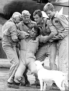 Pépé Boyington (Robert Conrad) soutenu par ses coéquipiers.