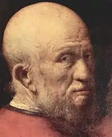 La scène présente trois personnages, d'âges différents, sur un fond sombre : le jeune homme au centre lit attentivement un morceau de papier sur lequel se dessinent deux lignes d'une portée musicale, l'adulte à sa gauche montre la même partition, ou peut-être marque le rythme, et un vieil homme au visage marqué de rides et de cicatrices tourne son regard vers l'observateur extérieur[9]. Il s'agit probablement du même homme, représenté à trois moments de sa vie[10].