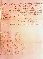I keep on hearing the police have caught me but they wont fix me just yet. I have laughed when they look so clever and talk about being on the right track. That joke about Leather Apron gave me real fits. I am down on whores and I shant quit ripping them till I do get buckled. Grand work the last job was. I gave the lady no time to squeal. How can they catch me now. I love my work and want to start again. You will soon hear of me with my funny little games. I saved some of the proper red stuff in a ginger beer bottle over the last job to write with but it went thick like glue and I cant use it. Red ink is fit enough I hope ha. ha. The next job I do I shall clip the ladys ears off and send to the police officers just for jolly wouldn't you. Keep this letter back till I do a bit more work, then give it out straight. My knife's so nice and sharp I want to get to work right away if I get a chance. Good Luck.