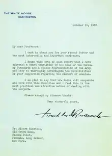 Après avoir pris connaissance du contenu de la lettre, Franklin Roosevelt autorise la création du Advisory Committee on Uranium, dont les membres se réunissent pour la première fois le . À sa tête se trouve Lyman Briggs, alors directeur du National Bureau of Standards. Un budget de 6 000 $ est alors alloué à Enrico Fermi de l'Université de Chicago pour ses expériences sur les neutrons.