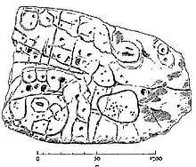 La pierre gravée de Sanct-Bélec en Leuhan correspond à la paroi ouest d'une sépulture située sous un tumulus de l'âge du bronze ; ce tumulus fut fouillé vers 1860 par Maurice Halna du Fretay et par Paul du Châtellier en 1901 qui la décrit dans un article du Bulletin de la Société archéologique du Finistère. Les gravures représentent des cupules, des cercles et divers autres figurations, dans lesquelles certains voient une figuration humaine informe et d'autres un animal[16]. Cette dalle est transférée au Musée des Antiquités nationales de Saint-Germain-en-Laye où elle est oubliée pendant un siècle dans les caves du musée où elle n'avait même pas été inventoriée.