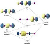 L'analyse NBO (en) de la liaison 3c-4e de l'anion triiodure I3− la considère comme la combinaison des orbitales moléculaires σ du diiode I2 et d'un doublet non liant d'un anion iodure I−. Ce dernier agit comme un donneur de deux électrons tandis que l'orbitale σ* antiliante du diiode agit comme un accepteur de deux électrons[7]. La combinaison en phase et en opposition de phase des orbitales donneuses et acceptrices d'électrons conduit au diagramme ci-contre. L'énergie de l'orbitale haute occupée Ψ2 baisse à la suite de la combinaison du doublet non liant donneur avec l'orbitale antiliante σ* acceptrice. Le diagramme ci-contre considère que le donneur se trouve du côté droit, mais un diagramme équivalent peut être construit en considérant que le donneur se trouve sur l'atome de gauche.