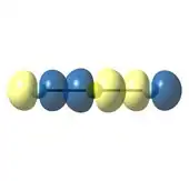 De la même manière, les orbitales moléculaires σ de l'anion triiodure I3− peuvent être modélisées en considérant les combinaisons en phase ou en opposition de phase des orbitales p de l'atome central et des atomes périphériques colinéaires[7]. Cet exercice produit le diagramme ci-contre. Les quatre électrons occupent les deux orbitales moléculaires de plus basse énergie, Ψ1 liante délocalisée le long des trois atomes et Ψ2 non liante localisée autour des atomes périphériques, tandis que l'orbitale moléculaire de plus haute énergie Ψ3, antiliante, demeure vacante. Cette représentation évite de considérer des liaisons hypervalentes au niveau de l'atome central car l'orbitale liante est constituée deux liaions à deux centres et un électron qui ne violent pas la règle de l'octet tandis que les deux autres électrons occupent l'orbitale non liante.
