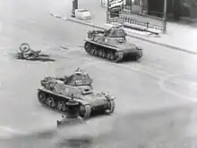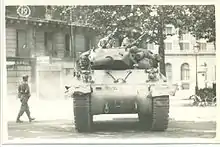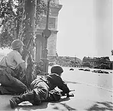 Malgré la garnison allemande encore puissante de 16 000 à 20 000 hommes, les éléments de la 2e DB du capitaine Dronne entrent dans Paris par la porte d'Italie et la porte d'Orléans le : la 9e compagnie du régiment de marche du Tchad (surnommée la Nueve, car essentiellement constituée de républicains espagnols), forte de 15 véhicules blindés (11 semi-chenillés, 4 véhicules[18]) précédés par 3 chars du 501e RCC[19], va se poster en renfort des FFI devant l'Hôtel de Ville, le à 21 h 22[20], pendant que les policiers parisiens actionnent le bourdon de la cathédrale Notre-Dame, en attendant le gros de la 2e division blindée.