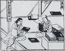 Un vendeur de livres et son client au Japon, gravure de 1690 (Bibliothèque nationale de la Diète, Tokyo).
