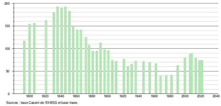 L'évolution du nombre d'habitants est connue à travers les recensements de la population effectués dans la commune depuis 1793. Pour les communes de moins de 10 000 habitants, une enquête de recensement portant sur toute la population est réalisée tous les cinq ans, les populations légales des années intermédiaires étant quant à elles estimées par interpolation ou extrapolation[21]. Pour la commune, le premier recensement exhaustif entrant dans le cadre du nouveau dispositif a été réalisé en 2008[22].